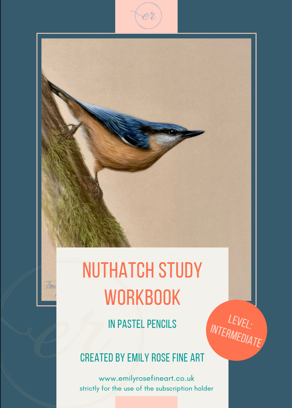 Full workbook with every stage written, your reference photos, materials list and extra information on techniques and theory. Also, over two hours of video tuition where you can watch me draw this Nuthatch and talk you through every step!